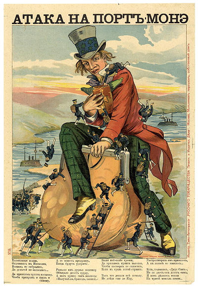 Не обійшлось і без американців. На зображеній нижче карикатурі прирівняно атаку на Порт-Артур до атаки на гроші американців, які нібито підштовхували Японію на війну. Цьому є спростування, адже насправді уряд ввів більший внутрішній податок на потреби армії.