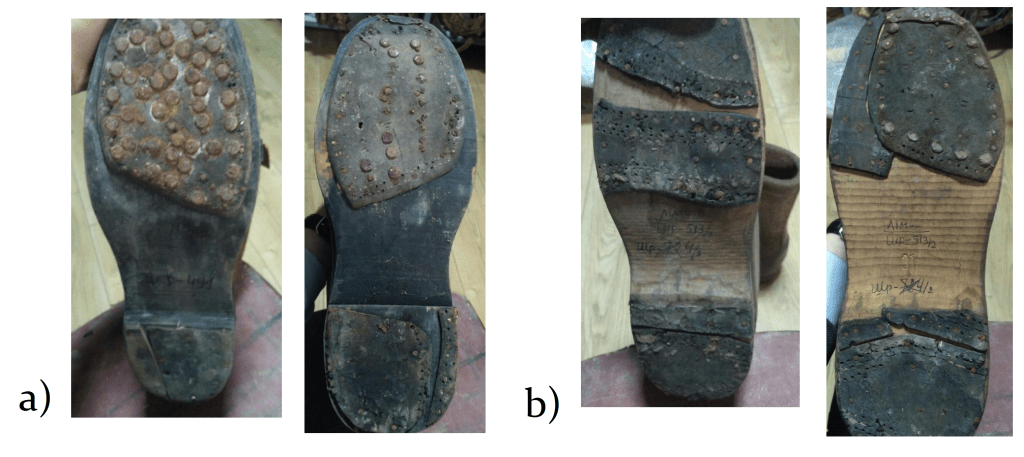 На нижній частині кожного черевика (Рис. 2, а), від жорсткого підноска до каблука не включно, розміщено по 7 зчетверених шипів з нікельованої сталі. Кожен шип кріпиться до підошви за допомогою двох цвяхів. Голівки шипів представляють собою чотирикутну піраміду та частково стерлись від експлуатації. Основа шипів представляє собою гладку сталеву пластину на кожній з яких вибите клеймо «R». Принагідно зауважимо, що маркування кожного шипа є характерним не для німецького військового взуття, а для черевиків моделі зразка 1939/1940 рр., що використовувалось Збройними силами Британської імперії у ході Тихоокеанської кампанії Другої світової війни [13, p. 109].
