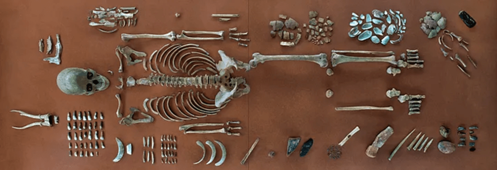 Поховання посипане червоною охрою, що видно, і на кістяку, і на деяких речах. Серед них було знайдено роги козулі, понад 40 зубів, серед яких 6 зубів кабана, 33 пробиті зуби тура та бізона, 16 різців та два ікла благородного оленя, частину стопи (плюсни) благородного оленя та козулі, плечова кістка журавля, що використовувалася як контейнер для крем’яних артефактів, фрагменти панцира прудової черепахи, кістки бобра, половинки щелеп козулі. Серед кам’яних речей: плоска сокира, плоска й трикутна кам’яна галька. І це лише частина. Усе поховання має форму прямокутної “коробки”, сплетеної ніби тин з матеріалу, схожого на лозу, покрита глиною та закрита дерев’яною кришкою.