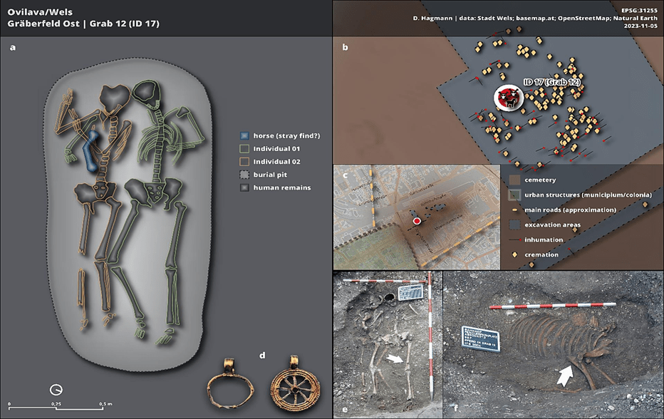 У 2004 р. під час розкопок цвинтаря з похованнями римської доби, де знаходилось місто Овілава, що було розташоване у південно-західній частині Норика, сучасна Австрія, знайшли комбіноване поховання. Спочатку виявили могилу з двома дорослими людськими тілами, похованими на глибині 80-100 см нижче рівня римської ходьби, трохи пізніше під ними було знайдено ще частину скелету коня. Цікаво, що рука особи 1 лежала навколо плеча особи 2.