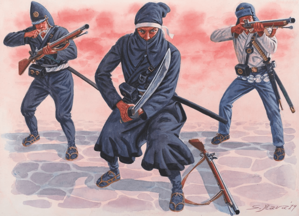 Перші “вестернізовані” підрозділи (де 1 – кадет” Такашіми Шухана, 1841; 2 – курсант академії Кабушо, 1856; 3 -вояк посольської варти, 1866)