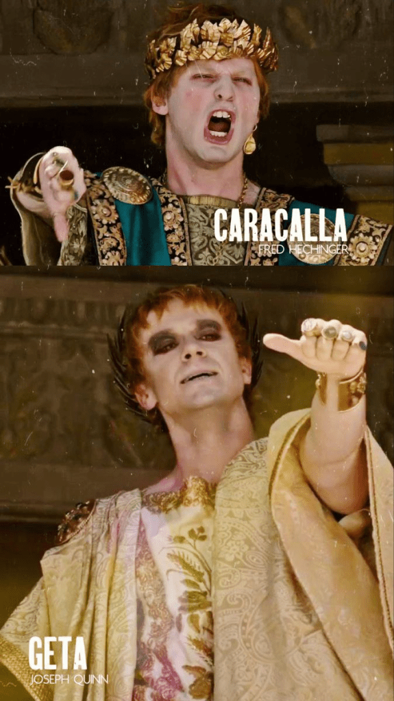 Насправді ж, правити вони почали якраз після смерті батька, тобто у 211 р. Актори, які підібрані на роль імператорів, з художньої точки зору попали в образ, який хотів зобразити режисер, однак їхні реальні прототипи дещо відрізняються. Каракалла, судячи з бюстів, був доволі брутальним, мужнім. Мав такі почесні титули перемоги: Sarmaticus («переможець сарматський») з 208 р.; Britannicus Maximus («великий переможець британський») з 209 р.; Adiabenicus («переможець адіабенський»), Arabicus («переможець арабський») з 211 р.; Germanicus Maximus («великий переможець германський»), Alamannicus («переможець алеманський») з 213 р.; Gothicus («переможець готський») з 215 р. Не збігається щось з тим, що пропонують нам творці фільму.