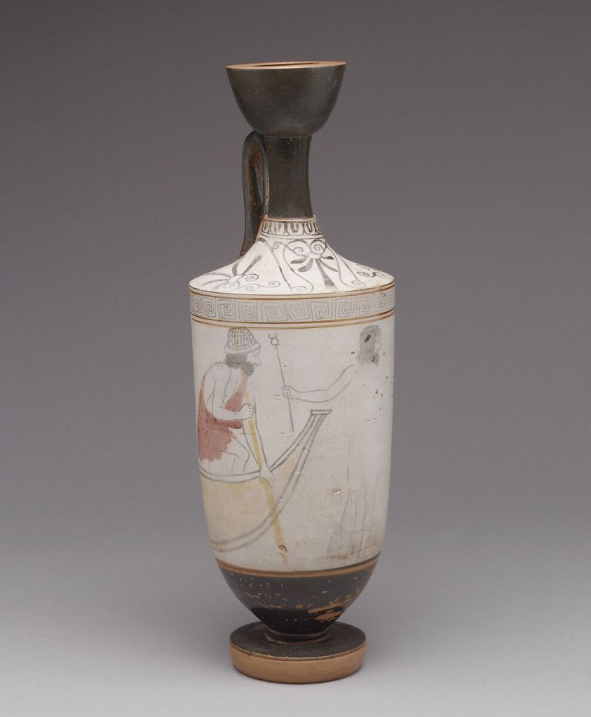 Лекіф теракотовий. Гермес, якого можна впізнати за крилатими черевиками та посохом, манить молодого чоловіка, який помер, до човна Харона. середина V ст. до н. е.