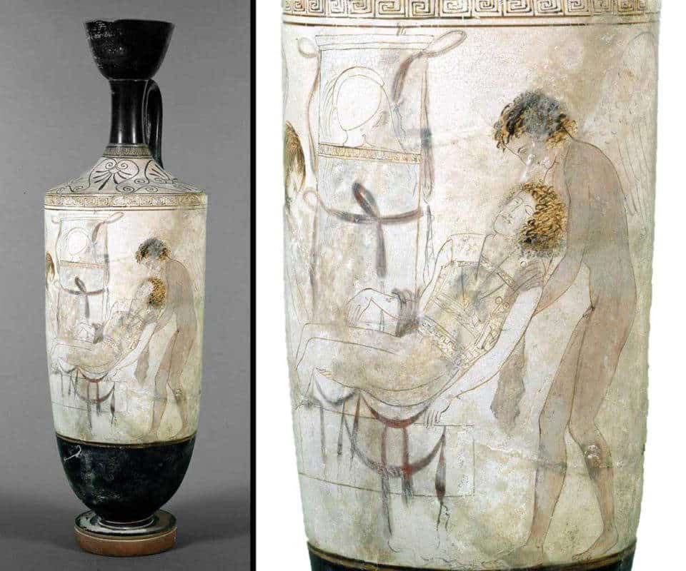 Похоронний лекіф із зображенням богів Танатоса і Гіпноса (Сон), які несуть мертвого воїна до його гробниці. Орієнтовно V-I ст. до н. е.