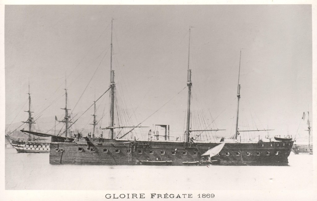 Першими створити успішний корабель змогли французи. Ним став броньований фрегат Gloire. Побудований у 1859 р., корабель був із усе ще дерев’яним силовим набором корпусу, на який були закріплені листи кованого заліза товщиною 110-120 мм [7, c. 4].