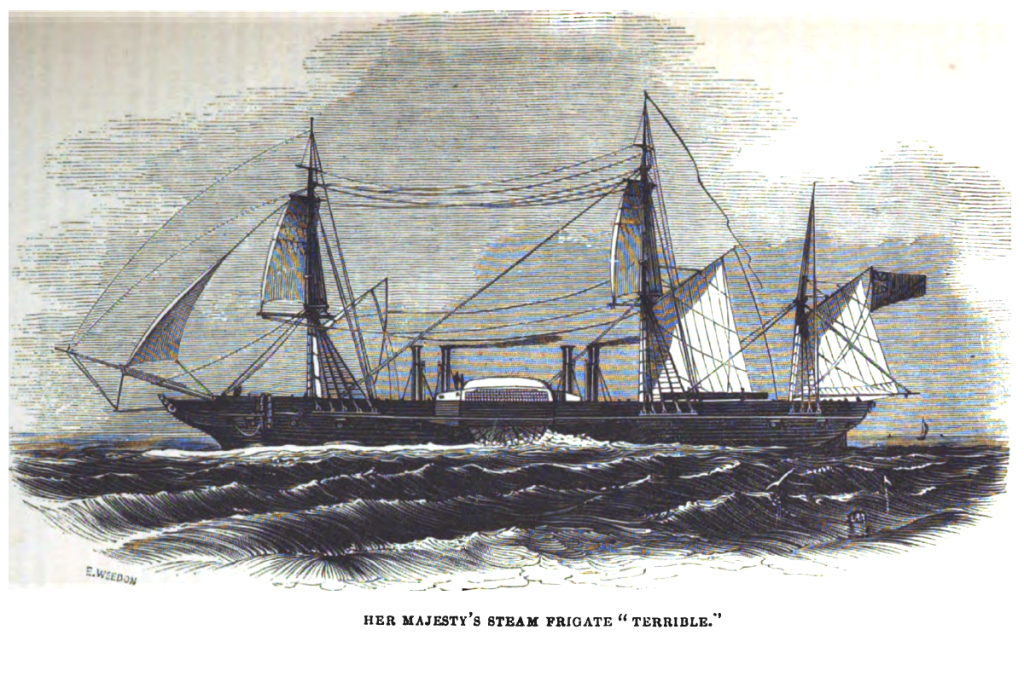 Вершиною розвитку колісних парових кораблів став фрегат HMS Terrible. Це був фрегат першого рангу, побудований у 1842-1845 рр. Він став найбільшим паровим бойовим кораблем свого часу. Довжина фрегату складала 68 метрів, ширина – 12 м., а водотоннажність – 3,189 тон. Розміри судна були подібні до 74-гарматних лінійних кораблів, однак він був озброєний лише 16-ма гарматами: 8*68 фунтовими та 8*56 фунтовими, пізніше замінені на нарізні гармати. Силова установка складалася з 4-циліндрової парової машини прямої дії, пару на яку давали чотири трубчасті котли. Загальна потужність складала 2059 кінських сил (далі – к. с.), що давало швидкість у 10.9 вузлів. Дим виводився через 4 труби [6, c.1227-1230].