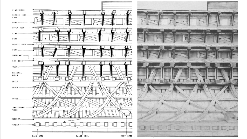 Першою новацією впровадженою в 1810-х рр. стала поява діагональних силових елементів. Початково вони були зроблені для посилення старих лінійних кораблів, однак пізніше завдяки ним було збільшено розмір кораблів та їх тоннажність. У поєднанні з більш ефективними корпусами усе це давало змогу будувати більші та важче озброєні й захищені лінійні кораблі з високою швидкістю. Таке різке збільшення розмірів призвело до значного підвищення цін на будівництво суден. Відповідно експлуатація флоту потребувала внесків великих сум. Англія із запланованих на 1815 рік 100 лінкорів до 1848 року зменшить цю кількість до 50 (з готовими матеріалами для 15 нових), забезпечуючи той же рівень переваги над потенційними противниками. Збільшення розмірів дозволило перейти до уніфікованої важкої артилерії калібром 32 фунти (160 мм) [5, c. 98-99]. Лінійні кораблі становили основну бойову силу флоту до 1860-х рр.