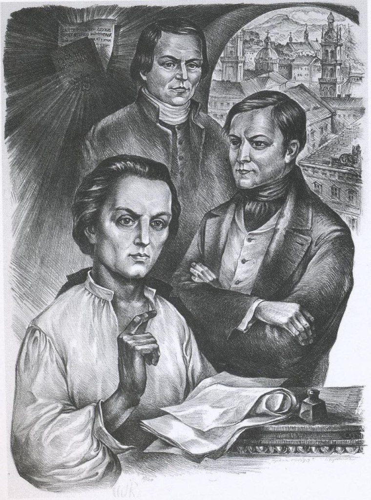 На рисунку зверху донизу Іван Вагилевич, Яків Головацький і Маркіян Шашкевич. Літографія.