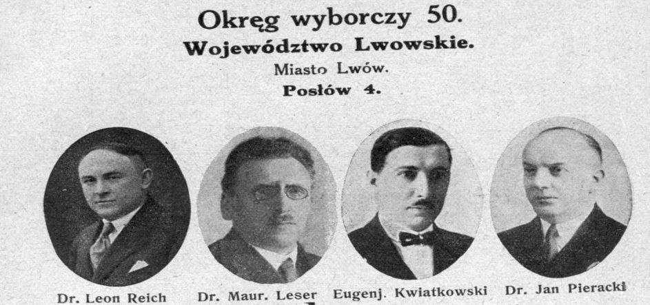 Вибрані депутати до сейму від м. Львова: Єврейський національний союз у Малопольщі – Леон Райх (1879-1929) та Маурицій Максиміліан Лесер (1884-1941); ББСУ – Еугеніуш Квятковський (1888-1974); Католицько-національний блок – Ян Пєрацький (1872-1940).