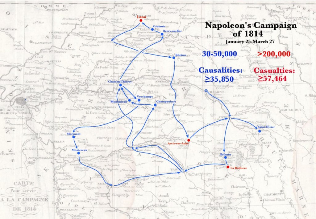 У надії прорватись у Голландію, щоби деблокувати французькі гарнізони, Наполеон рушив на північ і 7 березня розбив авангард армії Блюхера під Краоном. Однак, через два дні він зазнав невдачі під Ланом, куди на підмогу прусським військам підійшла армія Бернадота, і був змушений відступити в Суассон, а 20 березня – під Арсі-сюр-Об, де відбулась остання битва під командуванням Наполеона у кампанії 1814 р. “Бог воює на тій стороні, у якої за інших рівних умов більше військ” – визнавав Наполеон Бонапарт.