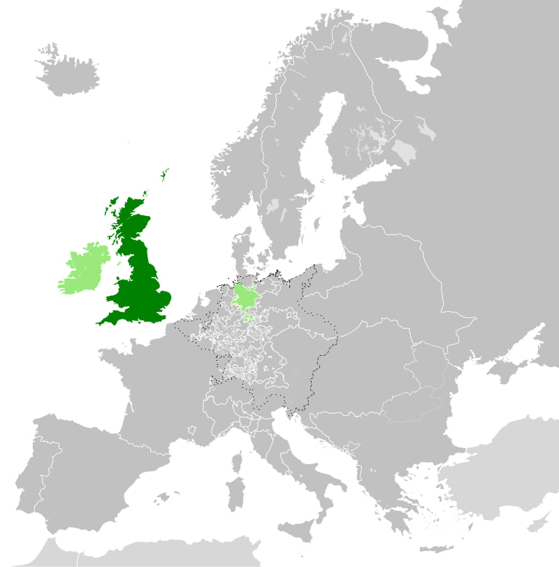 Мапа британсько-ганноверської унії (світло-зеленим) у 1789 році. Джерело: Wikipedia.