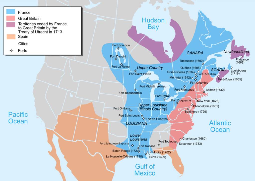 Мапа колоніального розподілу Північної Америки в 1750 році. Блакитним позначено володіння Франції, червоним – Великої Британії. Біля франко-британського кордону помітна низка населених пунктів, які передбачалося зробити фортецями та об’єднати Канаду й Луїзіану. Джерело: Wikipedia.