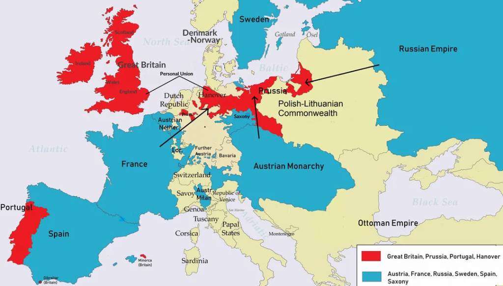 Мапа військових блоків Семирічної війни у Європі. Блакитним позначені країни, що доєдналися до франко-австрійського альянсу, а червоним – британсько-прусського. Джерело: Reddit.