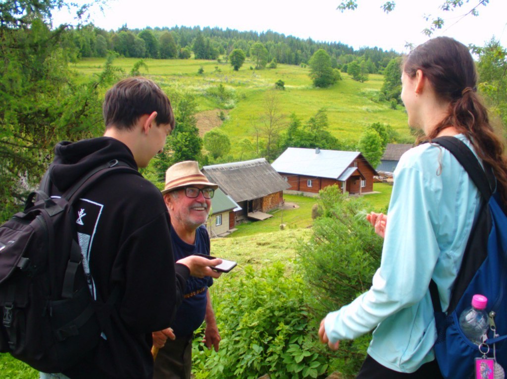 Мешканець села Хащованя Василь Любас. Опитування респондентів на околицях Бойківщини. На фото також студенти ЛНУ ім. Івана Франка.