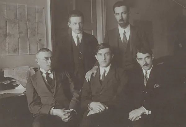 У редакції газети “Діло”, середина 1920-их рр.: перший зліва – Василь Мудрий, Роман Купчинський, Іван Кедрин-Рудницький; стоять: Федь Федорців (головний редактор) та Михайло Рудницький.
